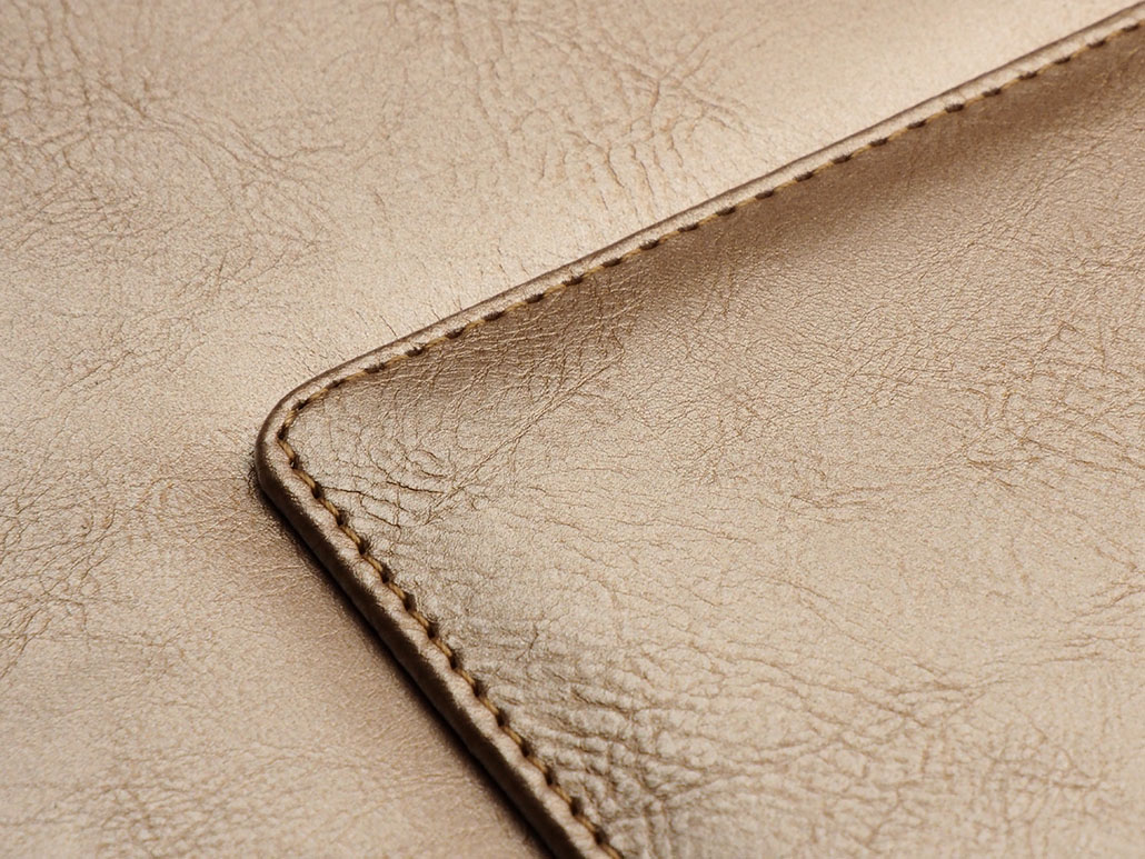 Ekokůže s jemnou strukturou přírodní kůže. Hřejivá a kožená na dotek. Pod reliéfem nemění barvu a vytváří diskrétní efekt loga.