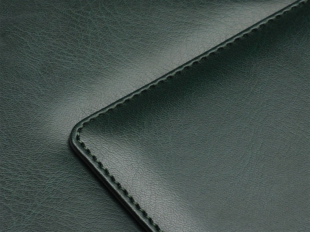 Ekokůže s jemnou strukturou přírodní kůže. Je kožená a chladná na dotek. Pod reliéfem se odbarvuje a vytváří výrazný, kontrastní efekt loga.