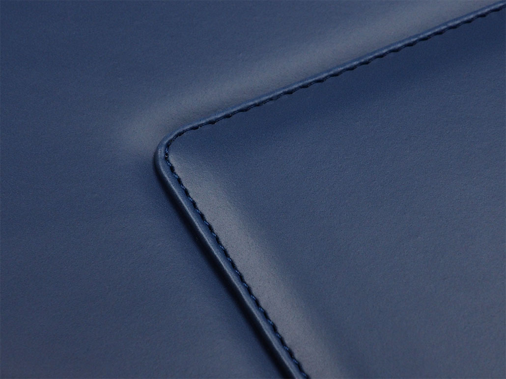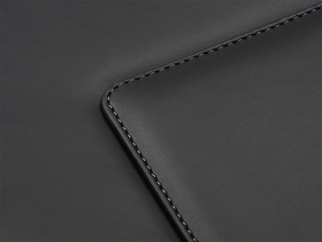 VEGAN Jablečná PU kůže, na jejíž výrobu se používá odpad, který zbyl z lisování jablečné šťávy. Slupky, stopky a vlákna se rozemelou na jemný prášek, který se smíchá s organickým pigmentem, polyesterem, polyuretanem, bavlnou a viskózou. Výsledkem je materiál, který je ze 40 % jablečný, ze 100 % veganský a na dotek příjemný jako alternativa přírodní kůže živočišného původu. Při ražbě se odbarvuje, čímž vzniká efekt průhledného, kontrastního loga.